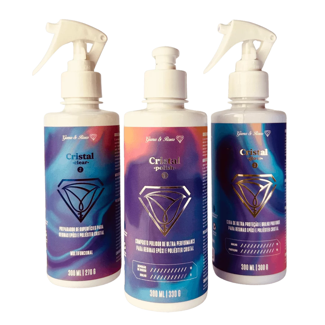 O Kit Cristal para Polimento e Proteção foi desenvolvido especialmente para quem busca acabamento profissional em peças de resina epóxi e poliéster. Composto por três produtos essenciais – Cristal Polish, Cristal Glow e Cristal Clear – este combo garante desde a limpeza da superfície até o brilho final com proteção de longa duração.